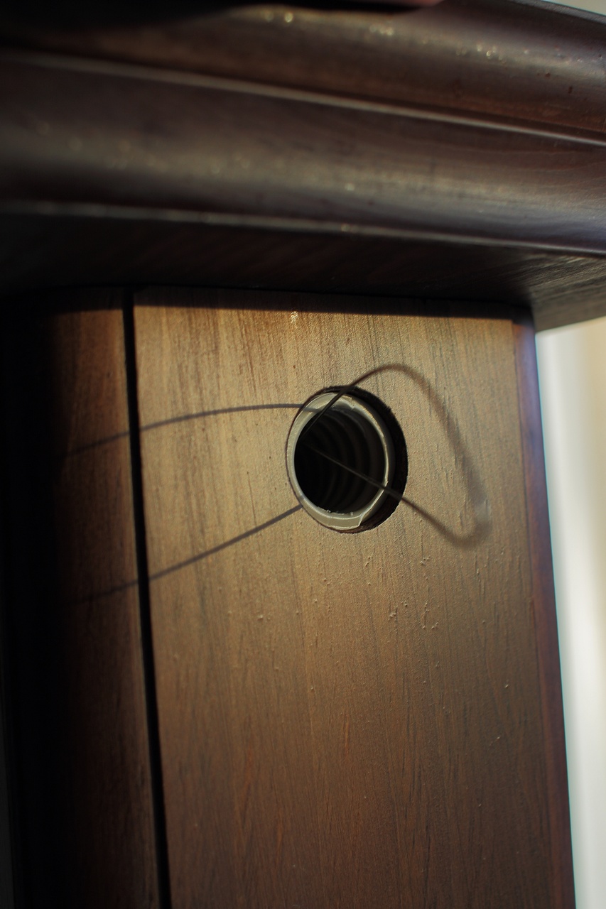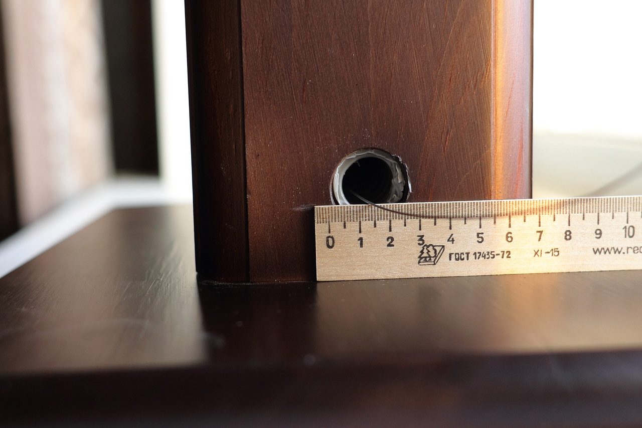 Не актуально с учётом переделки кабельного канала. Расстояние от верхнего края ноги до отверстия - 4-5 см., от нижнего края ноги - 2-3 см. Также необходимо оформить отверстия чуть более эстетично, чем на фотографиях, чтобы гофротруба не резала глаза. Можно даже сделать отверстия шире и чуть-чуть выступающую накладку. В-общем, здесь возможны варианты. Кроме того, нужно учесть, что ногу могут засыпать мелким песком, поэтому места соединения отверстия с гофрой и накладкой должны быть более-менее герметичными, чтобы песок не высыпался наружу.