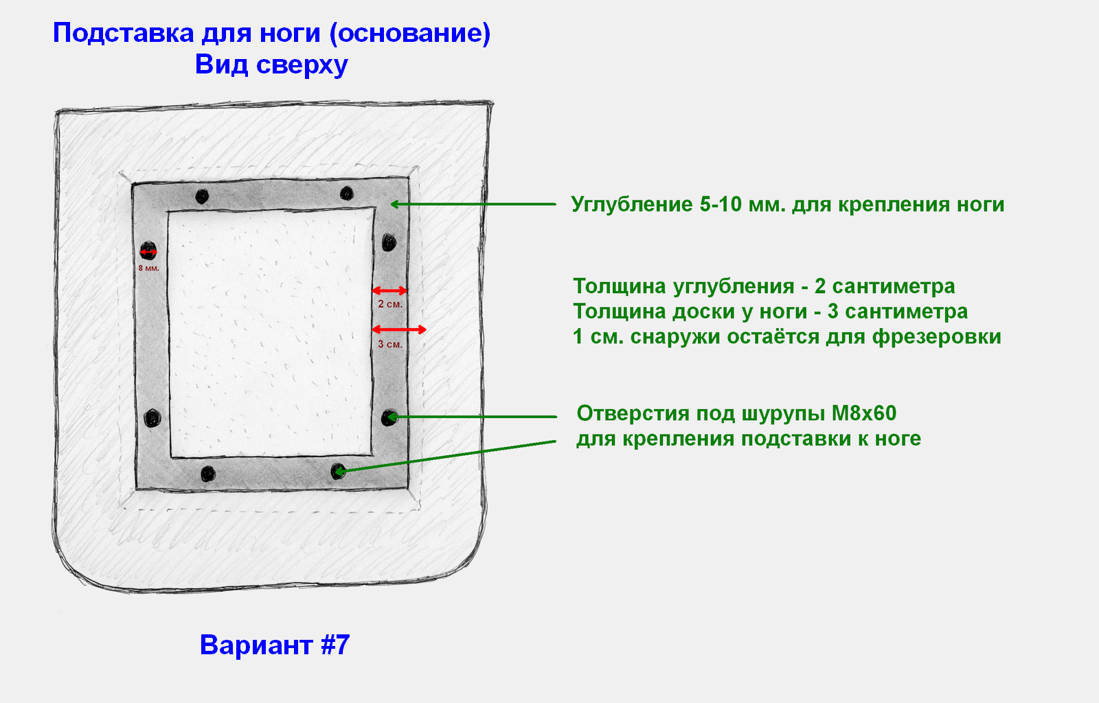 [ учочнить ] Для придания ноге стойки большей устойчивости можно сделать в верхней части основания углубления для ноги. Предполагаю, что 5-10 миллиметров будет достаточно. Но вы можете меня переубедить, если приведёте аргументы против этой идеи. Я вижу здесь только одну большую проблему - если углы у ноги будут скруглёнными или с красивой фрезеровкой, то вырезать подходящее отверствие в основании будет непросто. Но можно, например, сделать ноги из досок толщиной 3 см. вместо 2 см. - и тогда все проблемы будут сразу решены.
