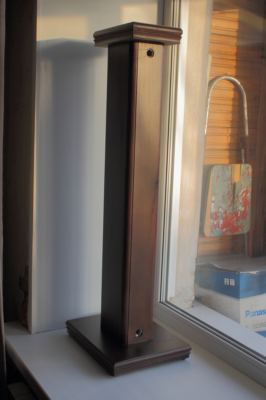 Надоело строгать скучные двери, однообразные столы и банальные табуретки? Хочется сотворить что-то необычное, очень сложное - с нестандартными техническими решениями и редкой фурнитурой, которую проще встретить в танке, чем в мебели? У меня есть интересное предложение. Необходимо изготовить стойки для акустики в количестве двух штук. Выглядят они примерно вот так: